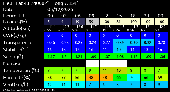 Ces paramètres sont fournis pour la nuit suivante de 12 h TU du jour en cours à 12h TU du jour suivant par pas de 3h.