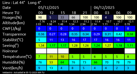 Ces paramètres sont fournis pour la nuit suivante de 12 h TU du jour en cours à 12h TU du jour suivant par pas de 3h.