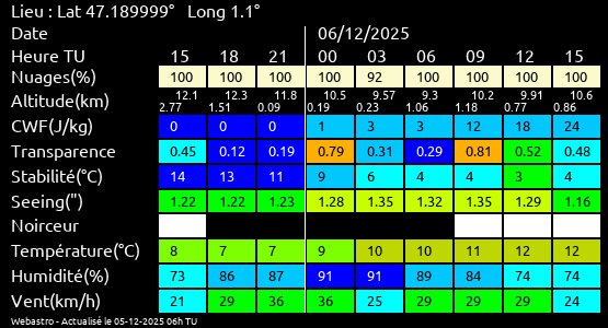 Ces paramètres sont fournis pour la nuit suivante de 12 h TU du jour en cours à 12h TU du jour suivant par pas de 3h.