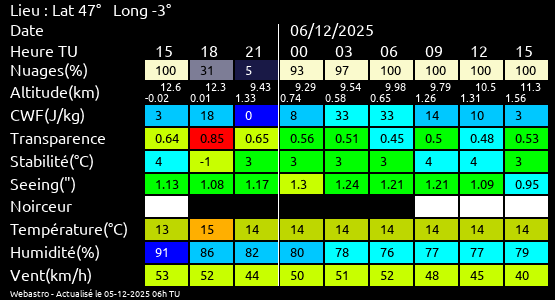 Ces paramètres sont fournis pour la nuit suivante de 12 h TU du jour en cours à 12h TU du jour suivant par pas de 3h.