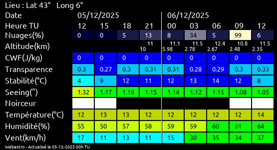 Ces paramètres sont fournis pour la nuit suivante de 12 h TU du jour en cours à 12h TU du jour suivant par pas de 3h.
