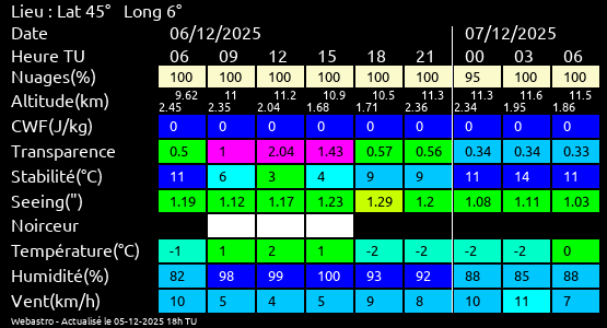 Ces paramètres sont fournis pour la nuit suivante de 12 h TU du jour en cours à 12h TU du jour suivant par pas de 3h.