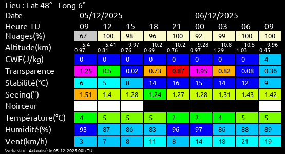 Ces paramètres sont fournis pour la nuit suivante de 12 h TU du jour en cours à 12h TU du jour suivant par pas de 3h.