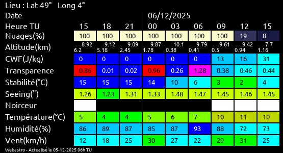 Ces paramètres sont fournis pour la nuit suivante de 12 h TU du jour en cours à 12h TU du jour suivant par pas de 3h.