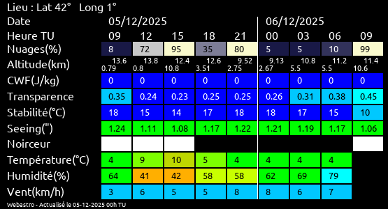 Note: Le "Met'astrogramme" est un tableau recapitulant les prévisions de différents paramètres pour estimer les conditions lors d'observation du ciel.