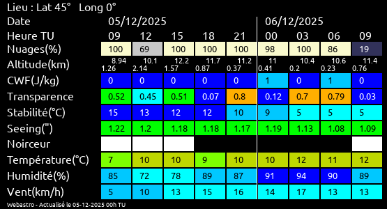 Ces paramètres sont fournis pour la nuit suivante de 12 h TU du jour en cours à 12h TU du jour suivant par pas de 3h.
