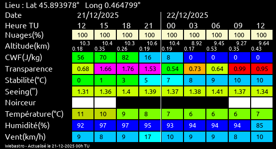 Ces paramètres sont fournis pour la nuit suivante de 12 h TU du jour en cours à 12h TU du jour suivant par pas de 3h.