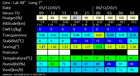 Ces paramètres sont fournis pour la nuit suivante de 12 h TU du jour en cours à 12h TU du jour suivant par pas de 3h.