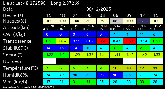 Ces paramètres sont fournis pour la nuit suivante de 12 h TU du jour en cours à 12h TU du jour suivant par pas de 3h.