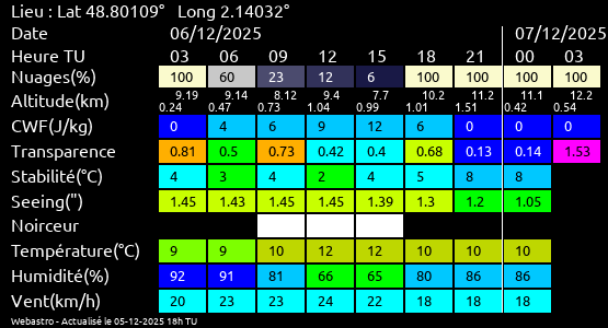 Ces paramètres sont fournis pour la nuit suivante de 12 h TU du jour en cours à 12h TU du jour suivant par pas de 3h.