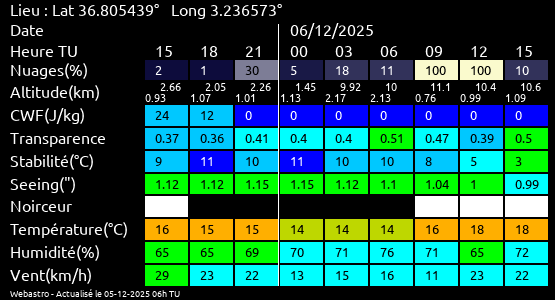 Note: Le "Met'astrogramme" est un tableau recapitulant les prévisions de différents paramètres pour estimer les conditions lors d'observation du ciel.