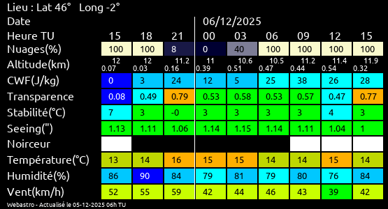 Ces paramètres sont fournis pour la nuit suivante de 12 h TU du jour en cours à 12h TU du jour suivant par pas de 3h.