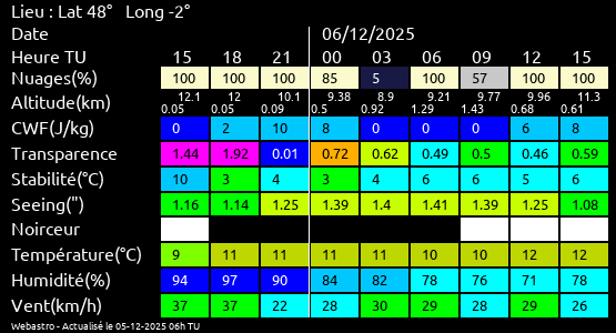 Ces paramètres sont fournis pour la nuit suivante de 12 h TU du jour en cours à 12h TU du jour suivant par pas de 3h.