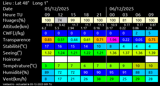 Ces paramètres sont fournis pour la nuit suivante de 12 h TU du jour en cours à 12h TU du jour suivant par pas de 3h.