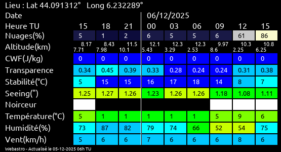 Ces paramètres sont fournis pour la nuit suivante de 12 h TU du jour en cours à 12h TU du jour suivant par pas de 3h.