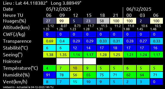 Ces paramètres sont fournis pour la nuit suivante de 12 h TU du jour en cours à 12h TU du jour suivant par pas de 3h.