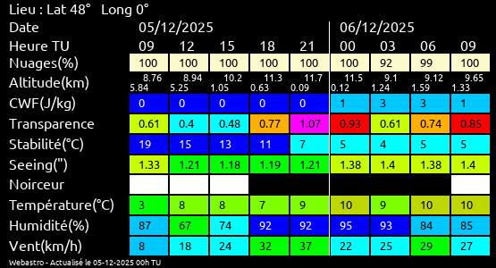 Ces paramètres sont fournis pour la nuit suivante de 12 h TU du jour en cours à 12h TU du jour suivant par pas de 3h.