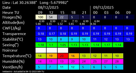 Note: Le "Met'astrogramme" est un tableau recapitulant les prévisions de différents paramètres pour estimer les conditions lors d'observation du ciel.