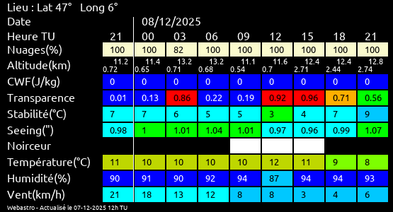 Ces paramètres sont fournis pour la nuit suivante de 12 h TU du jour en cours à 12h TU du jour suivant par pas de 3h.