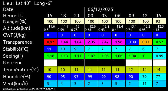 Ces paramètres sont fournis pour la nuit suivante de 12 h TU du jour en cours à 12h TU du jour suivant par pas de 3h.