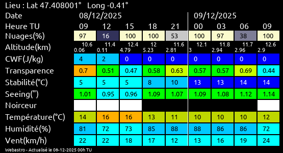 Note: Le "Met'astrogramme" est un tableau recapitulant les prévisions de différents paramètres pour estimer les conditions lors d'observation du ciel.