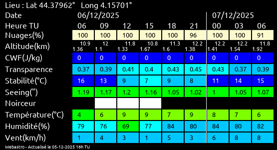 Ces paramètres sont fournis pour la nuit suivante de 12 h TU du jour en cours à 12h TU du jour suivant par pas de 3h.