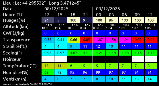 Ces paramètres sont fournis pour la nuit suivante de 12 h TU du jour en cours à 12h TU du jour suivant par pas de 3h.