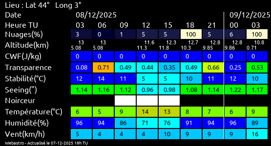 Ces paramètres sont fournis pour la nuit suivante de 12 h TU du jour en cours à 12h TU du jour suivant par pas de 3h.