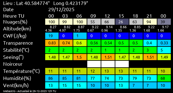 Ces paramètres sont fournis pour la nuit suivante de 12 h TU du jour en cours à 12h TU du jour suivant par pas de 3h.