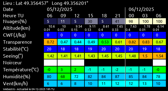 Ces paramètres sont fournis pour la nuit suivante de 12 h TU du jour en cours à 12h TU du jour suivant par pas de 3h.