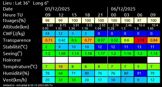 Ces paramètres sont fournis pour la nuit suivante de 12 h TU du jour en cours à 12h TU du jour suivant par pas de 3h.