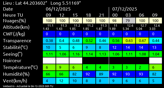 Ces paramètres sont fournis pour la nuit suivante de 12 h TU du jour en cours à 12h TU du jour suivant par pas de 3h.