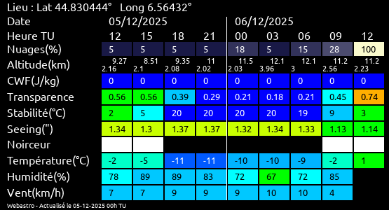 Ces paramètres sont fournis pour la nuit suivante de 12 h TU du jour en cours à 12h TU du jour suivant par pas de 3h.