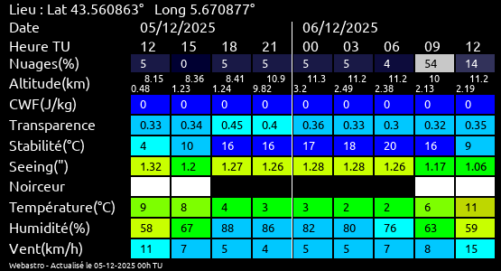 Note: Le "Met'astrogramme" est un tableau recapitulant les prévisions de différents paramètres pour estimer les conditions lors d'observation du ciel.