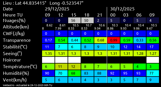 Note: Le "Met'astrogramme" est un tableau recapitulant les prévisions de différents paramètres pour estimer les conditions lors d'observation du ciel.