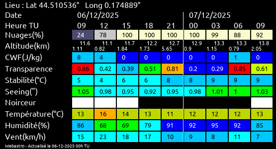Ces paramètres sont fournis pour la nuit suivante de 12 h TU du jour en cours à 12h TU du jour suivant par pas de 3h.