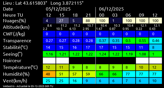 Note: Le "Met'astrogramme" est un tableau recapitulant les prévisions de différents paramètres pour estimer les conditions lors d'observation du ciel.
