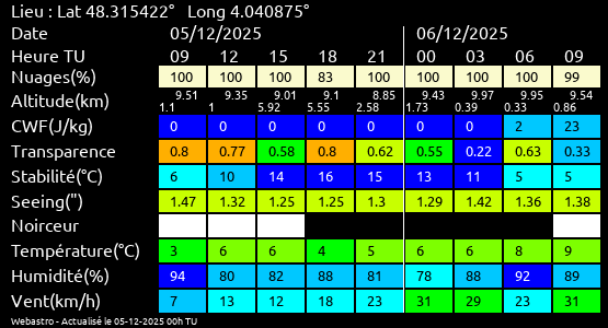 Ces paramètres sont fournis pour la nuit suivante de 12 h TU du jour en cours à 12h TU du jour suivant par pas de 3h.