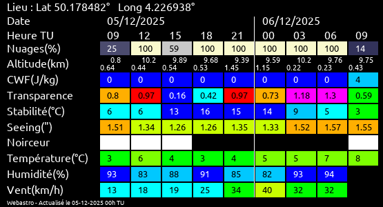 Ces paramètres sont fournis pour la nuit suivante de 12 h TU du jour en cours à 12h TU du jour suivant par pas de 3h.