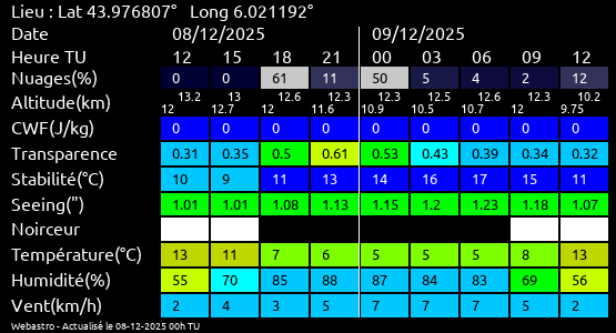 Note: Le "Met'astrogramme" est un tableau recapitulant les prévisions de différents paramètres pour estimer les conditions lors d'observation du ciel.