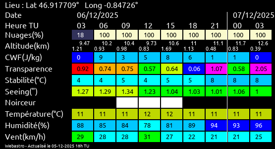 Ces paramètres sont fournis pour la nuit suivante de 12 h TU du jour en cours à 12h TU du jour suivant par pas de 3h.