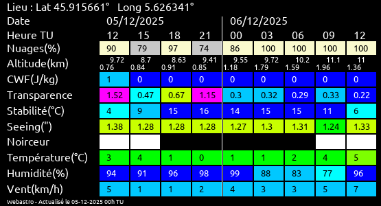 Ces paramètres sont fournis pour la nuit suivante de 12 h TU du jour en cours à 12h TU du jour suivant par pas de 3h.