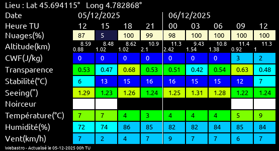 Ces paramètres sont fournis pour la nuit suivante de 12 h TU du jour en cours à 12h TU du jour suivant par pas de 3h.