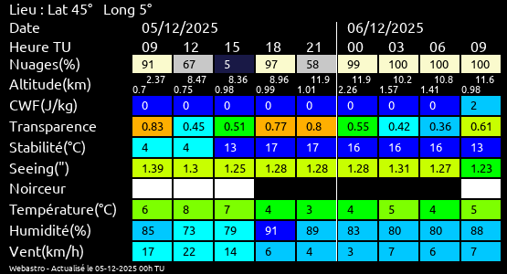 Ces paramètres sont fournis pour la nuit suivante de 12 h TU du jour en cours à 12h TU du jour suivant par pas de 3h.