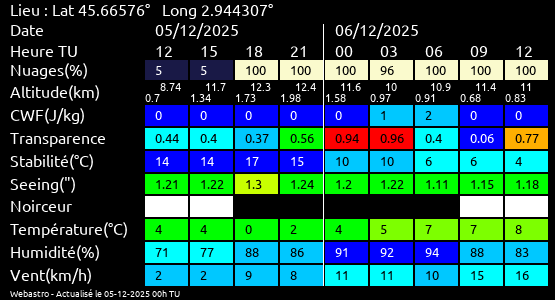 Ces paramètres sont fournis pour la nuit suivante de 12 h TU du jour en cours à 12h TU du jour suivant par pas de 3h.