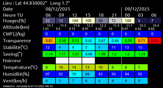 Note: Le "Met'astrogramme" est un tableau recapitulant les prévisions de différents paramètres pour estimer les conditions lors d'observation du ciel.