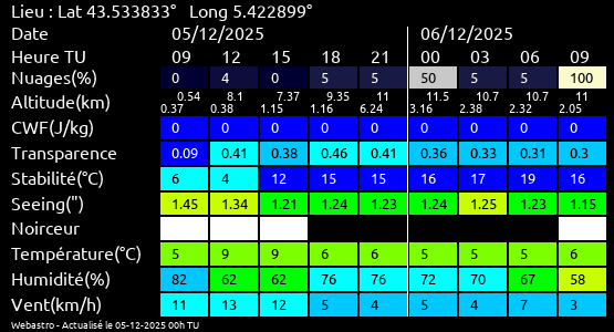 Note: Le "Met'astrogramme" est un tableau recapitulant les prévisions de différents paramètres pour estimer les conditions lors d'observation du ciel.