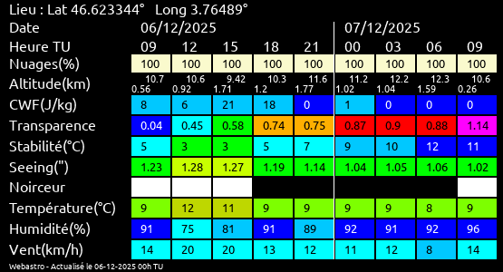 Ces paramètres sont fournis pour la nuit suivante de 12 h TU du jour en cours à 12h TU du jour suivant par pas de 3h.