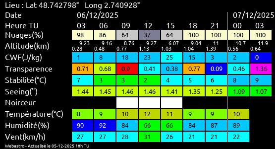 Ces paramètres sont fournis pour la nuit suivante de 12 h TU du jour en cours à 12h TU du jour suivant par pas de 3h.