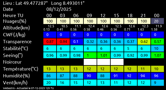 Note: Le "Met'astrogramme" est un tableau recapitulant les prévisions de différents paramètres pour estimer les conditions lors d'observation du ciel.